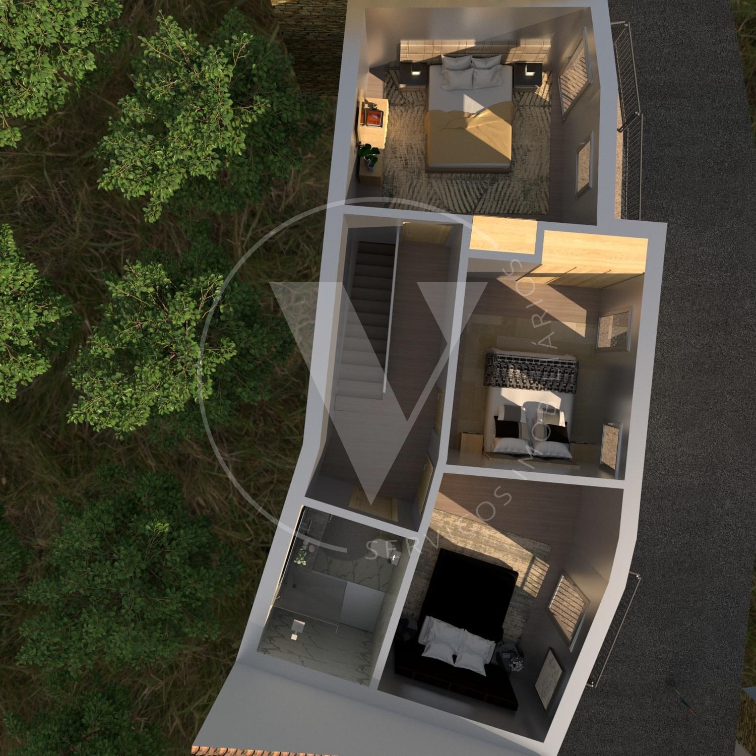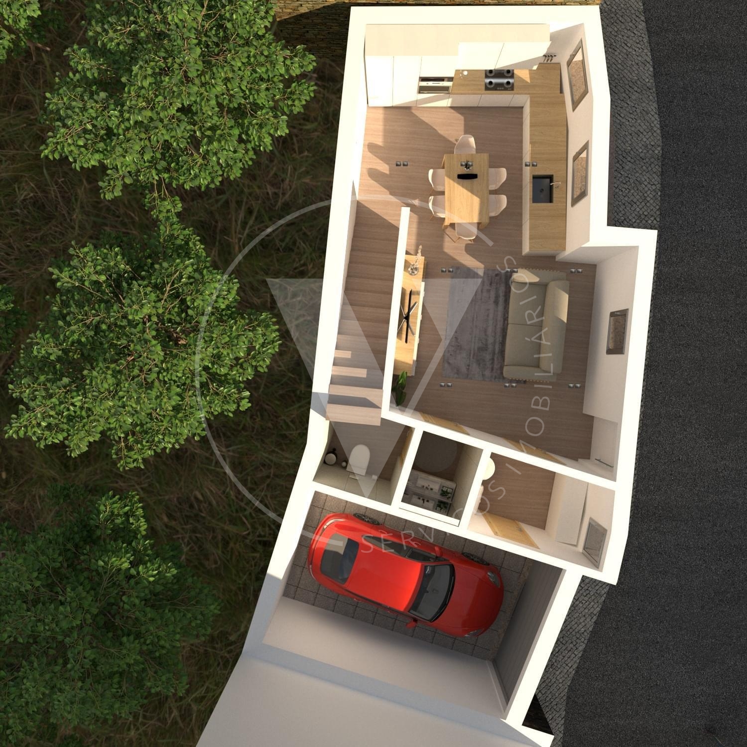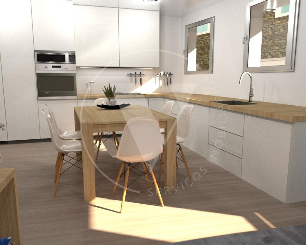 No rés do chão encontra-se uma garagem, zona de lavandaria/despensa, casa de banho de serviço e uma ampla área em open space que integra sala e cozinha, criando um ambiente acolhedor e funcional, ideal para o dia a dia e momentos de convívio. No primeiro piso, a moradia dispõe de três quartos com áreas generosas e uma casa de banho completa de apoio, garantindo conforto, privacidade e uma excelente entrada de luz natural.