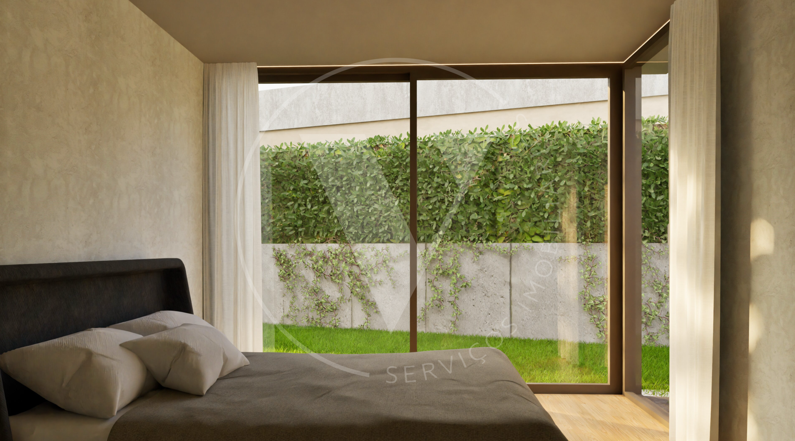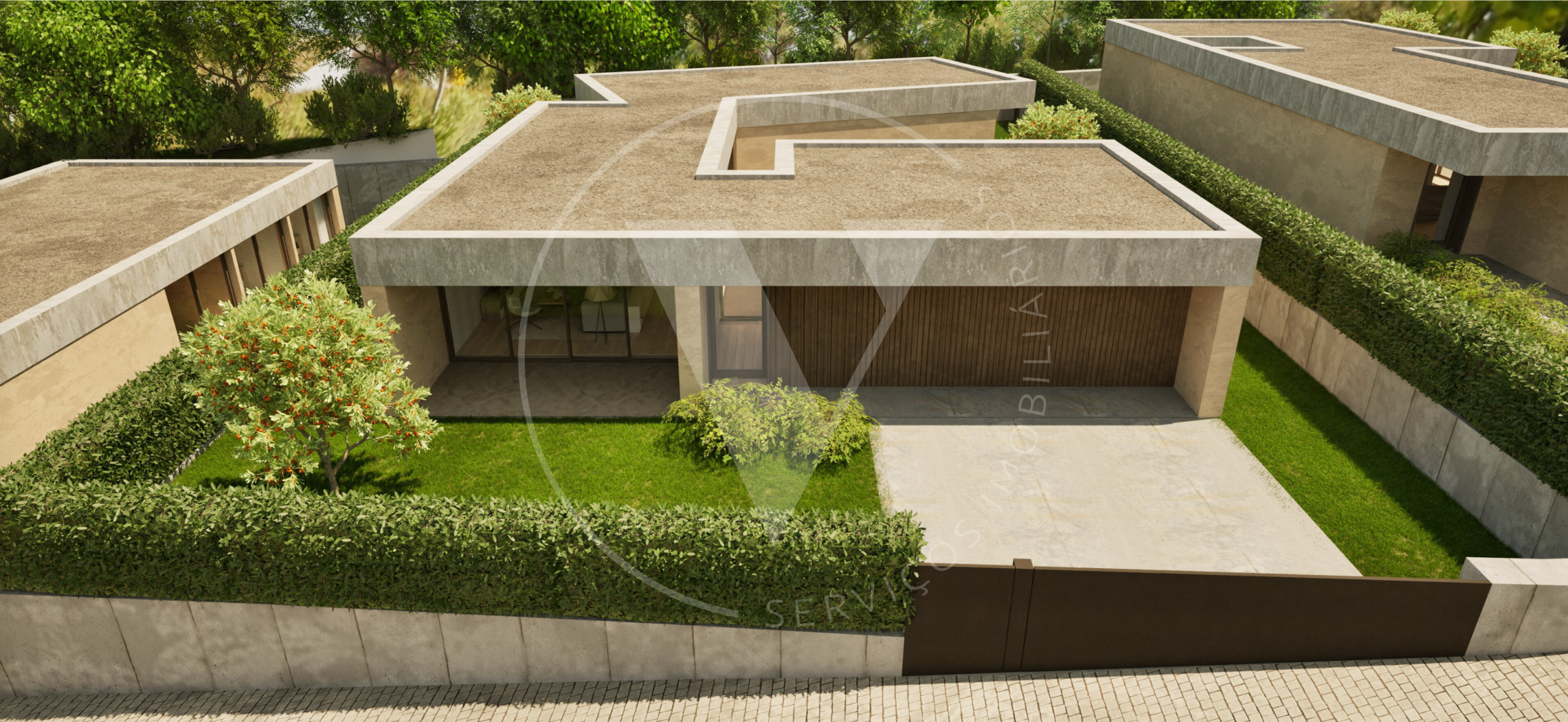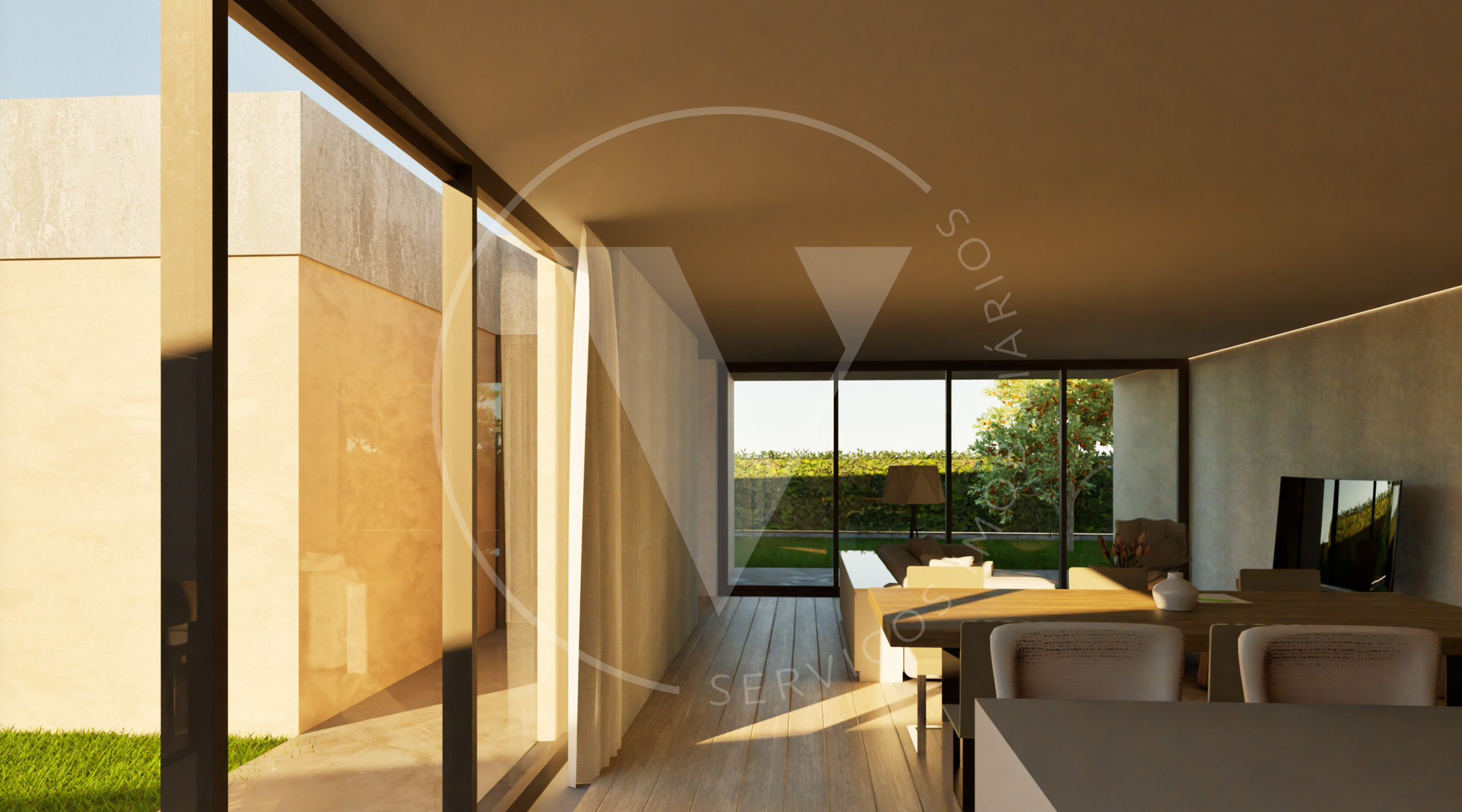 O projeto foi cuidadosamente concebido com uma linguagem arquitetónica minimalista, privilegiando a luz natural através de amplas superfícies envidraçadas que integram harmoniosamente os espaços interiores com o jardim envolvente. A configuração em “L” da casa proporciona privacidade e vistas abertas para o espaço verde interior.